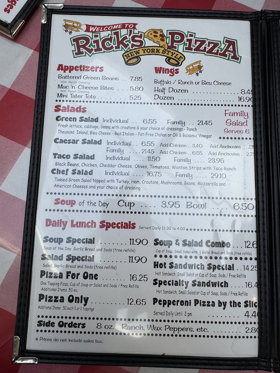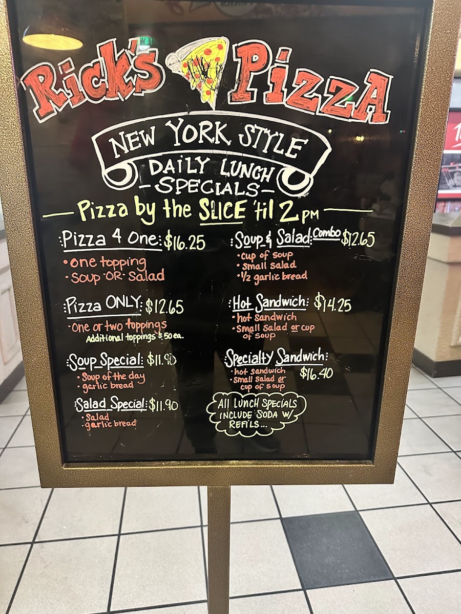 Their menu doesn't stop at pizza, either. You’ll also find hearty pasta dishes, fresh salads, and mouthwatering appetizers that are perfect for sharing. The casual atmosphere makes it a great place for family dinners, date nights, or grabbing a quick bite with friends. Whether you’re a long-time pizza lover or new to Rick’s, the variety and quality are sure to impress. Don’t forget to pair your meal with one of their refreshing beverages to complete your meal!